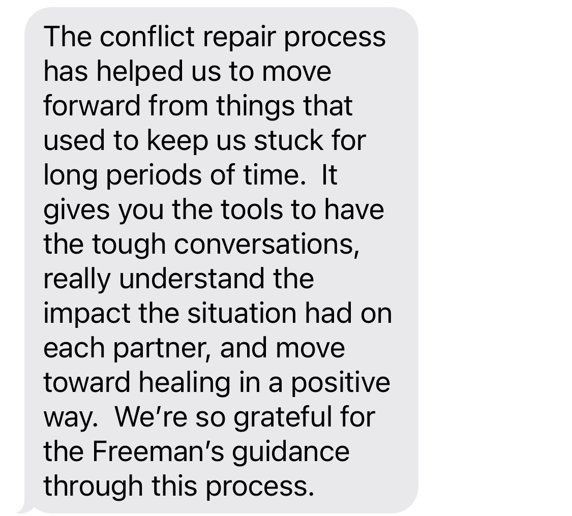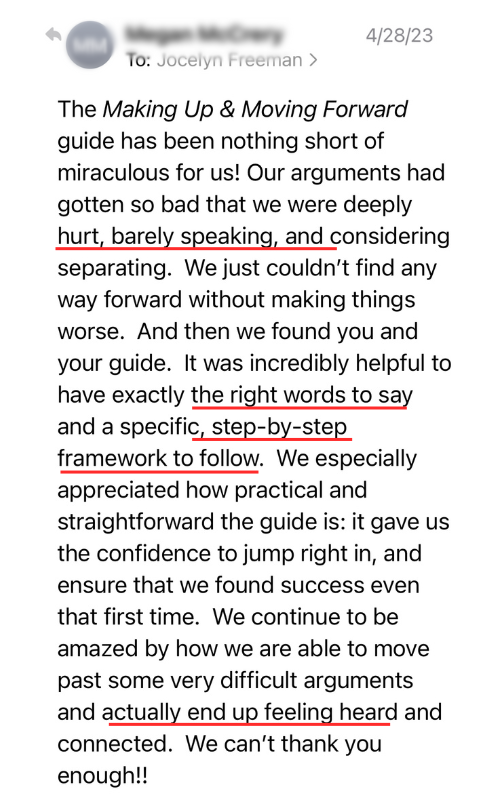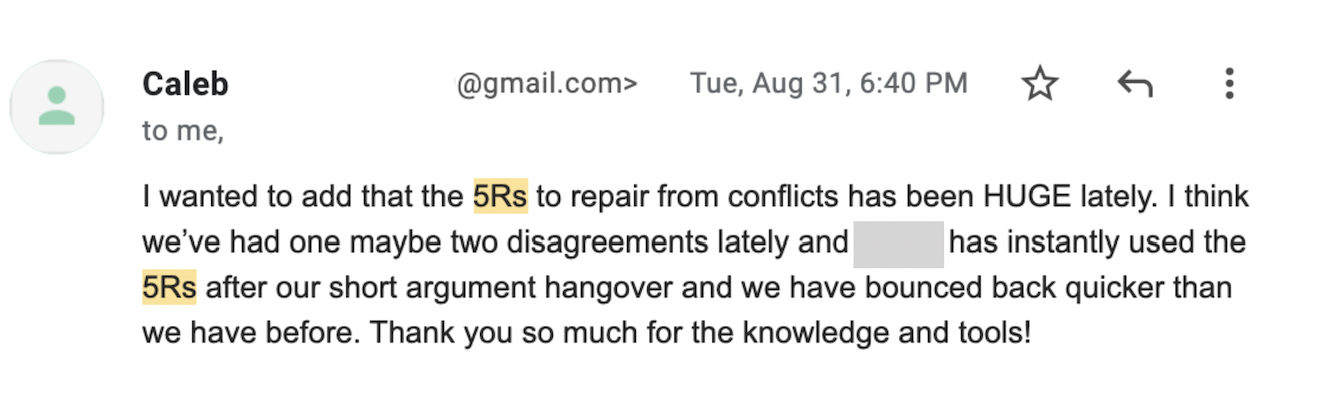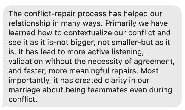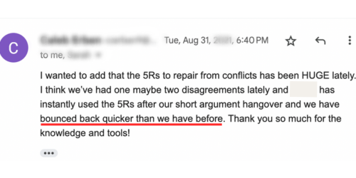 You may think the argument is over, but the emotional residue left behind resurfaces in future conversations. If you don't repair the damage from an argument, it builds into resentment and a lack of respect over time. We see this happening every day in our private coaching with couples.